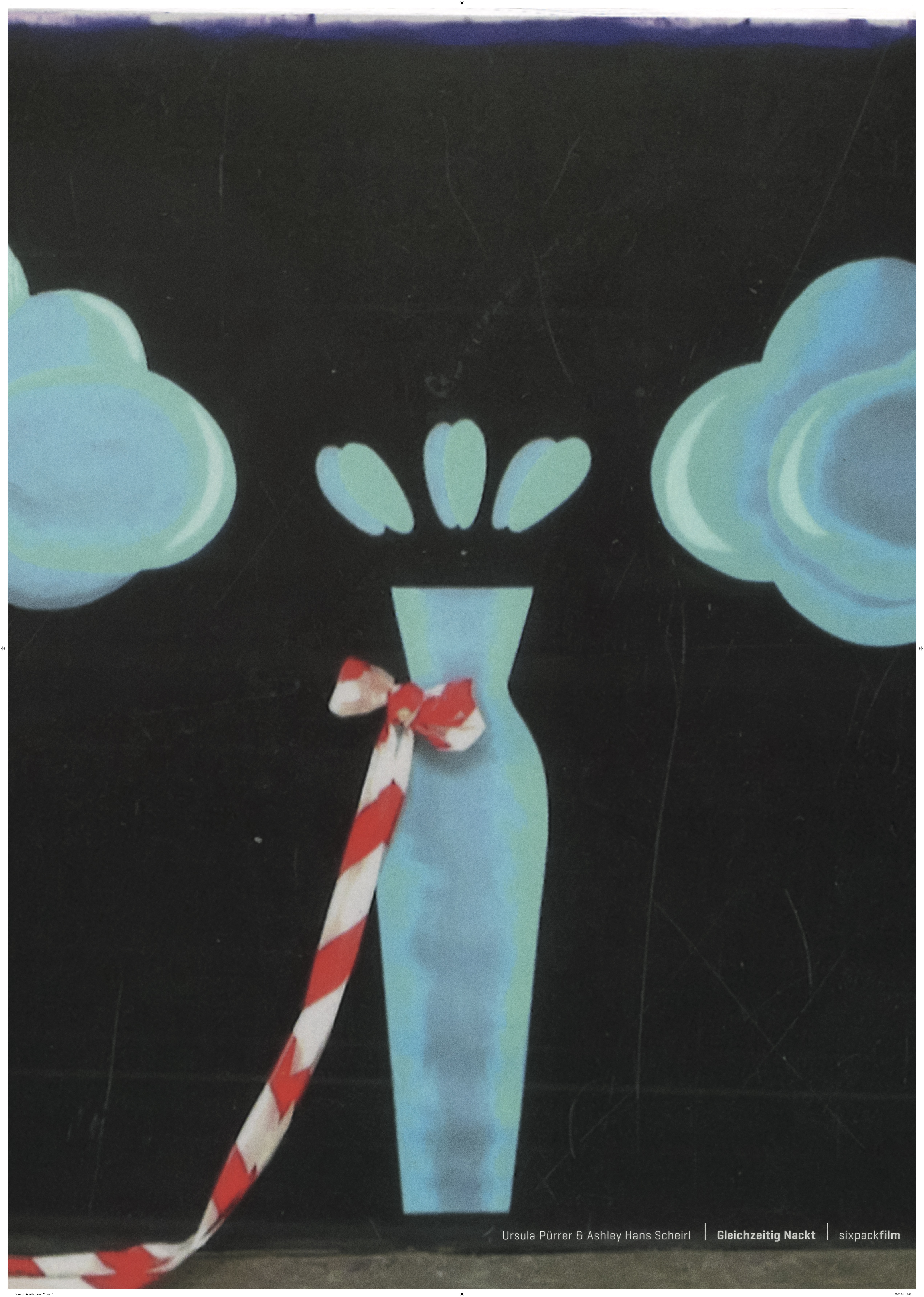 Two people, read as female, appear simultaneously naked before the camera. They take the stage in front of a stationary backdrop reminiscent of a variety show, moving pretty unambitiously to the rhythm of a Viennese waltz before exiting the stage three minutes later. The choreography: left arm to the hip, minimal hip swing; right arm to the hip, minimal hip swing; one step forward, one step back. Repeat. A black canvas hangs in the background painted with two blue clouds to the left and right, and a blue vase in the center containing an abstract bouquet of flowers, adorned by an actual bow of red-white-red barrier tape – these also happen to be the colors of the Austrian flag. On stage, a painter's atelier table with a sponge cuts into the left edge of the foreground. The waltz we hear was composed by Johann Strauss – in German a "Strauß" is a bouquet of flowers – entitled “The Blue Danube”, echoing the blue of the stage's backdrop. The allusions are clear and simultaneously ironic, the scene is ambiguous and wonderfully imperfect as staged by Ashley Hans Scheirl and Ursula Pürrer for this short film, which is in fact a remake.
