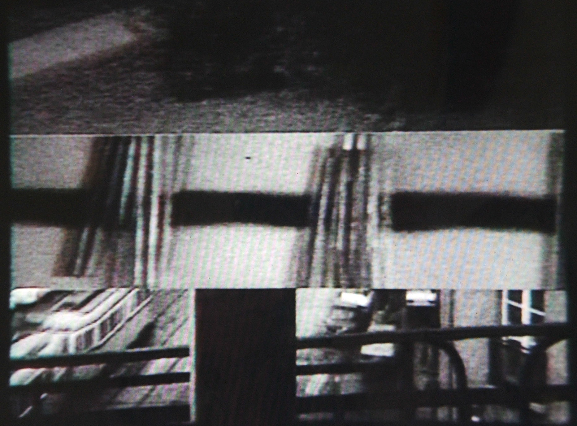The image, divided into three horizontal fields, shows three separately recorded 1-second camera swings made from the same subject, copied mechanically together afterwards. The sound corresponds to the camera swings by improvised vocal glissandi. An attempt to expand space producing changing montages of the elements, inducing it automatically by shifts in time. (D.M.)