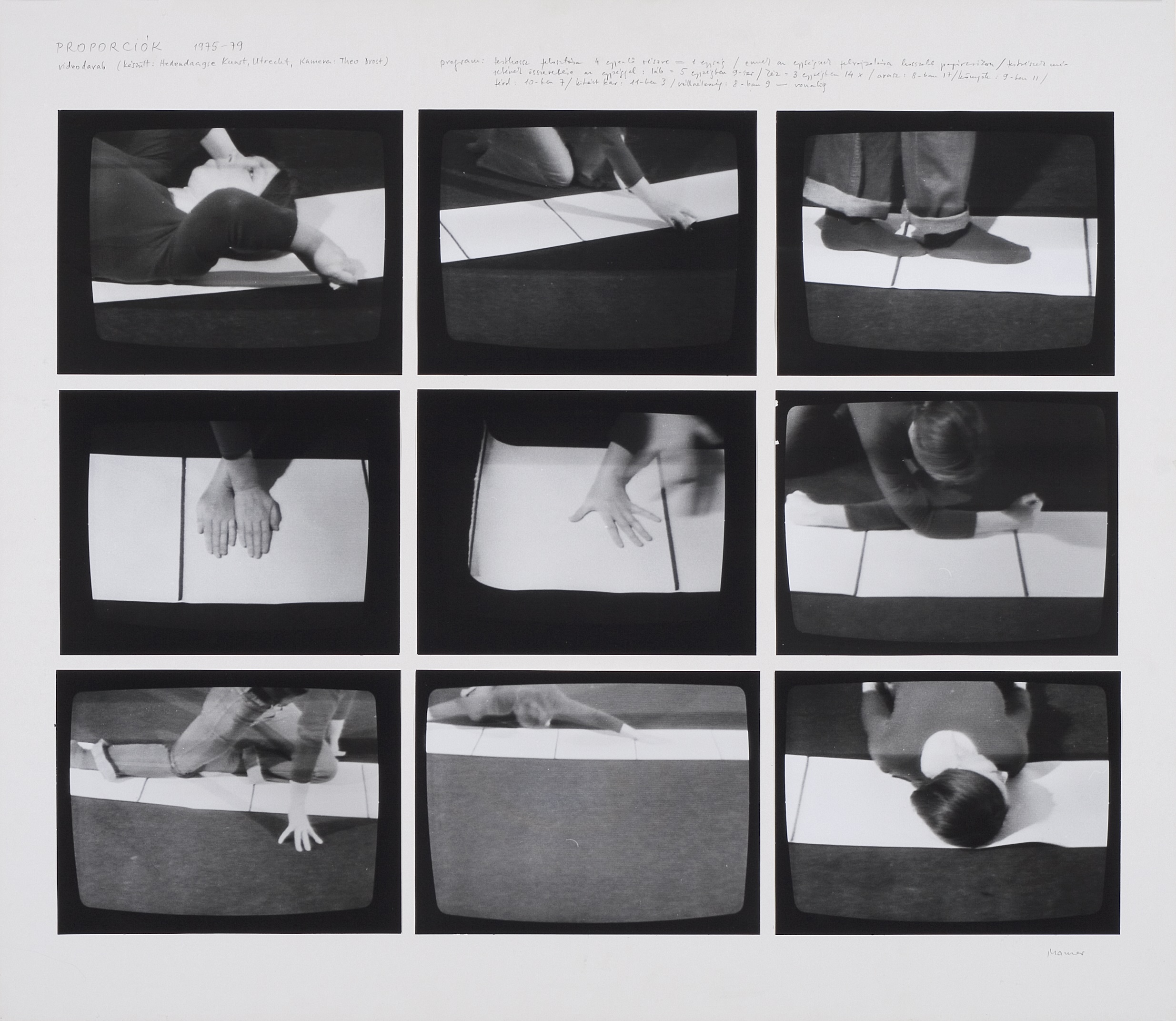 In Proportionen nimmt Maurer – auf einem langen, weißen Papierstreifen liegend – die eigene Körperlänge als Basismaßstab, sie halbiert diese Strecke, viertelt sie dann, um schließlich mit der Markierung weiterer Viertel aus ihren Proportionen Notenlinien zu schaffen, die sie mit lokalen Werten ihres eigenen Körpers rhythmisch ausfüllt. (István Antal)