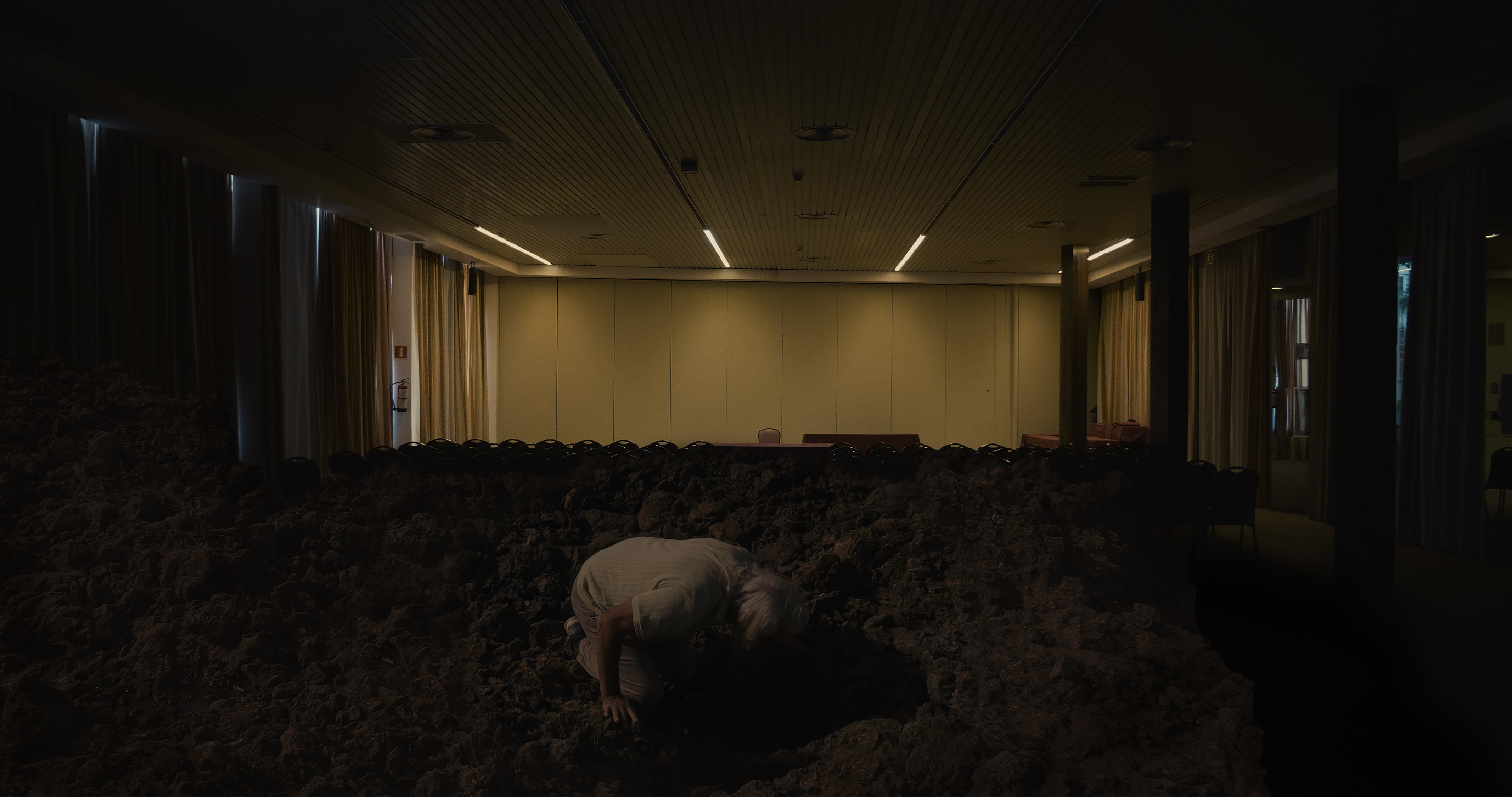“It’s a question, a fear that keeps coming back: whether these thoughts can skip from Ralf to me,” Lukas Marxt says at one point. He’s lying on a table, in a somehow therapeutic setting, with an auditorium of empty rows of chairs behind him. “Somehow” isn’t a filler word when writing about this film, but a key. Everything visible is clear and distinct before us and somehow always difficult to describe: waves somehow break in the reflections of glass hotel doors, confined interior spaces somehow expand into the desert in the depth of the image, a pan scans the visible space and at the same time somehow creates space for another image. Six years after Ralf’s Colors, Marxt and his artistic collaborator Michel Petri return with this film: to one place, Lanzarote, to one person: Ralf Lüddemann, to his form of perceiving the world, the planetary work. And in their search for the traces that Lüddemann’s thinking – which some might call confused, unrealistic, or manic – has left in them and their artistic work, they also somehow return to themselves.